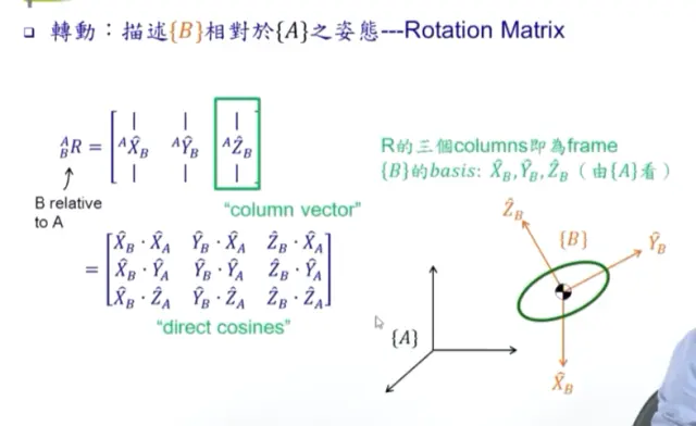 其中,BAR^A_BR 表示 body frame BB 对 world frame AA 的坐标,依次用 XXYYZZ 的 column vector (长度都是 1)表示,也表示三主轴对 frame AA 的投影。叫做旋转矩阵